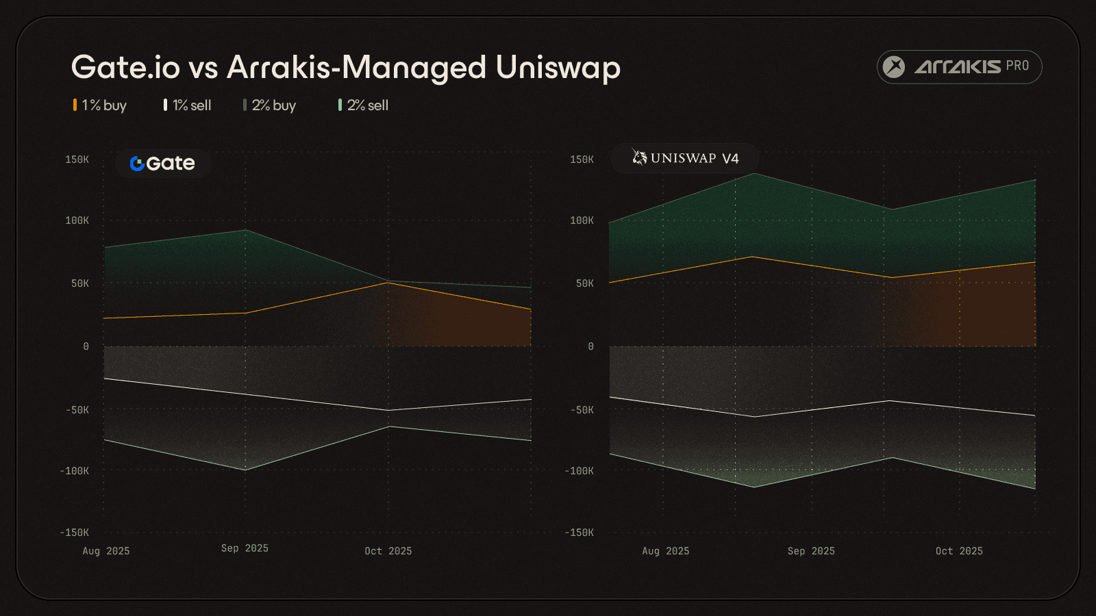 Arrakis-managed Uniswap pools showed ~55% greater depth at 1-2% levels than Gate.io across all monthly snapshots.
