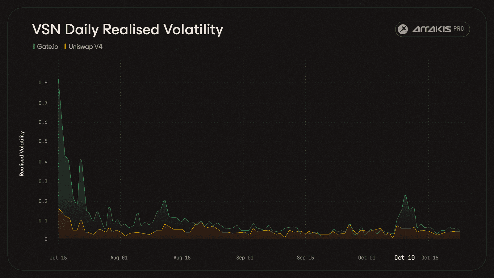Throughout the analysis period, realized volatility on the Uniswap V4 VSN/USDC pool ran up to 40% lower than Gate.io's VSN/USDT market, with the gap widening most during the October 10th event.