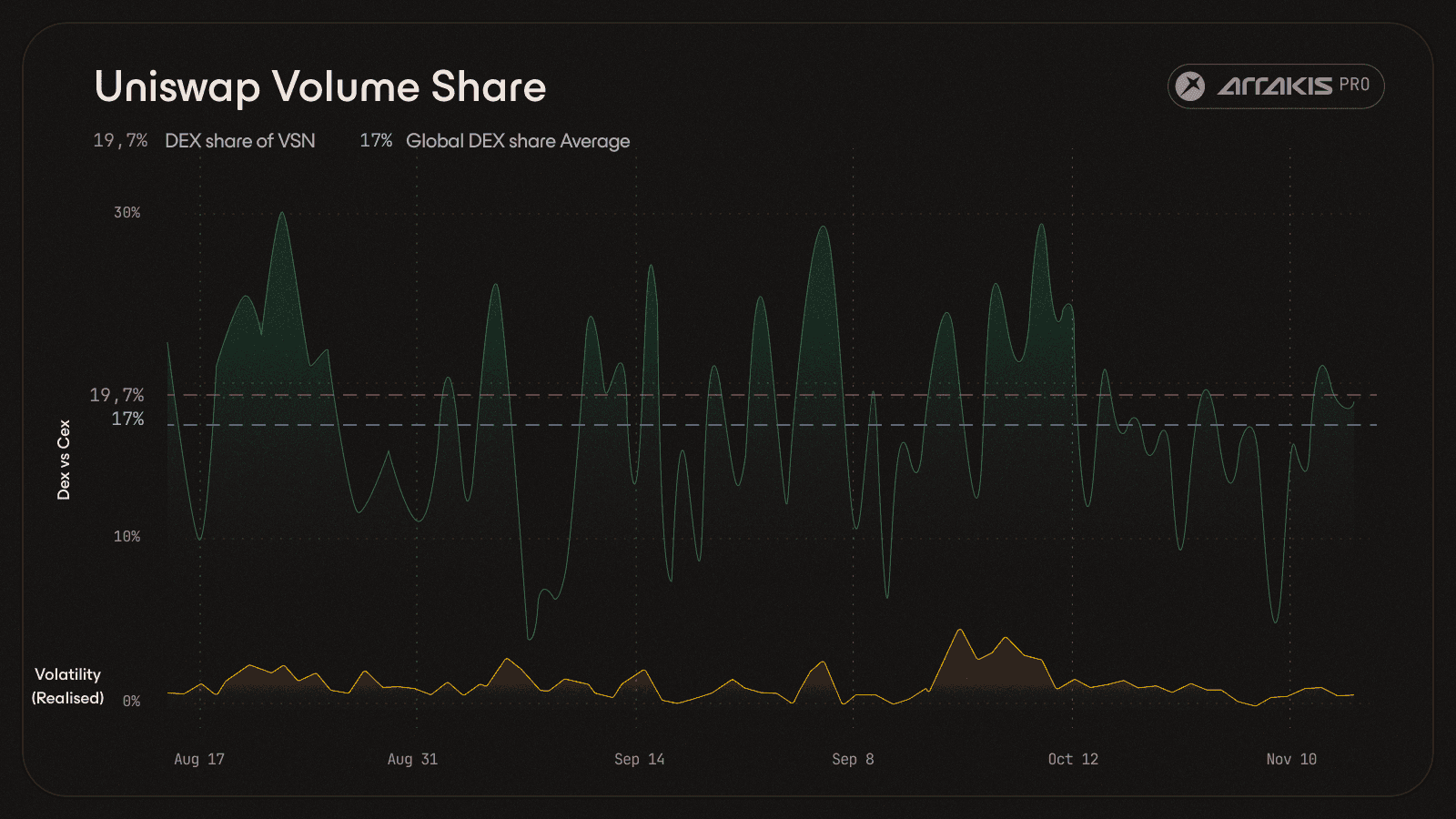 Uniswap captured ~20% of total VSN spot volume post-TGE, ahead of MEXC, KuCoin, and Kraken individually, proving onchain liquidity can compete with CEX listings when managed properly.