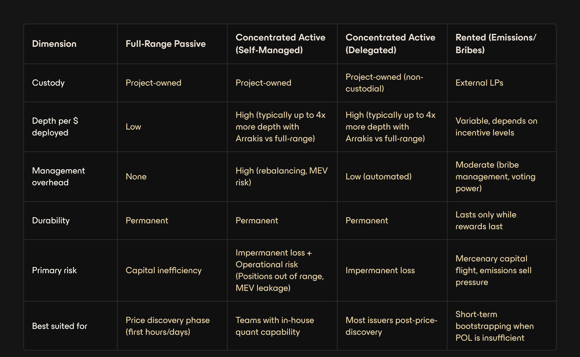 Every DEX liquidity position sits at the intersection of these two choices. A full-range POL position optimizes for durability and simplicity. A concentrated POL position optimizes for depth per dollar but requires active management. A rented position offloads capital requirements but introduces external dependencies and is often too expensive to maintain sustainably, as projects typically overpay for the liquidity they attract.