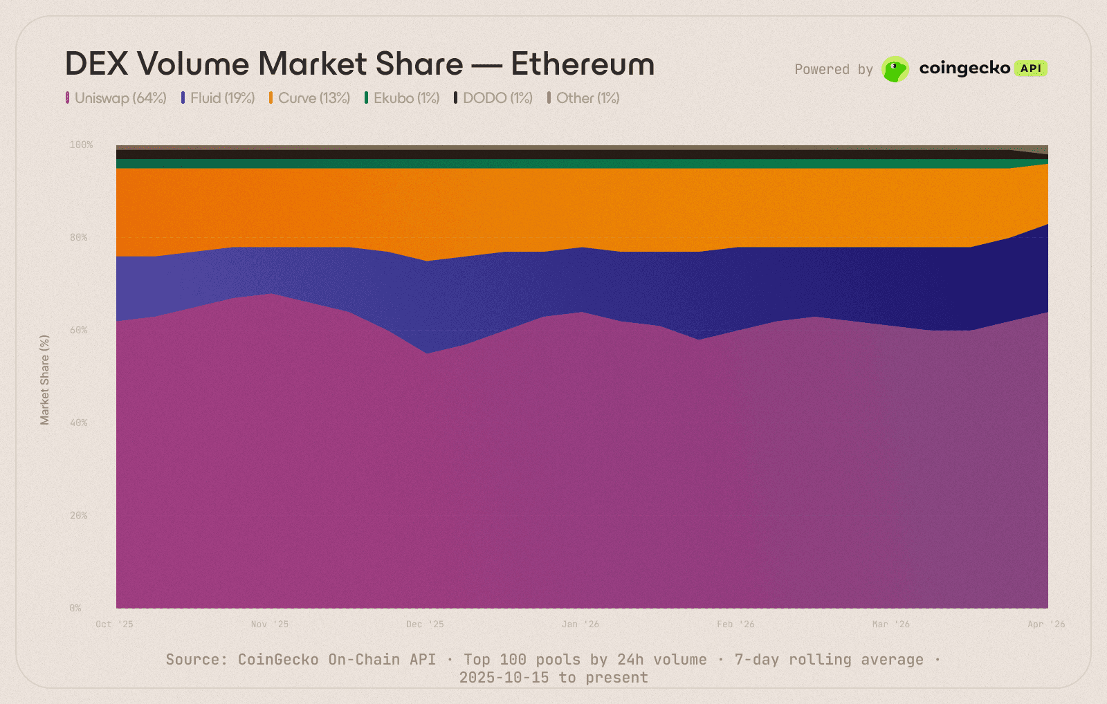 Which DEX: On Ethereum, Uniswap commands the majority of DEX volume (64 %). The Uniswap frontend remains the most used DEX frontend, making Uniswap the default venue for organic retail flow. Aggregators route to the best execution across all venues, but the Uniswap frontend advantage on Ethereum is structural and worth prioritizing.