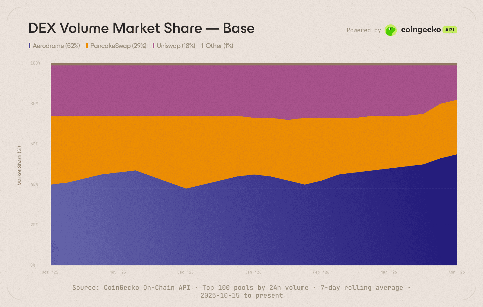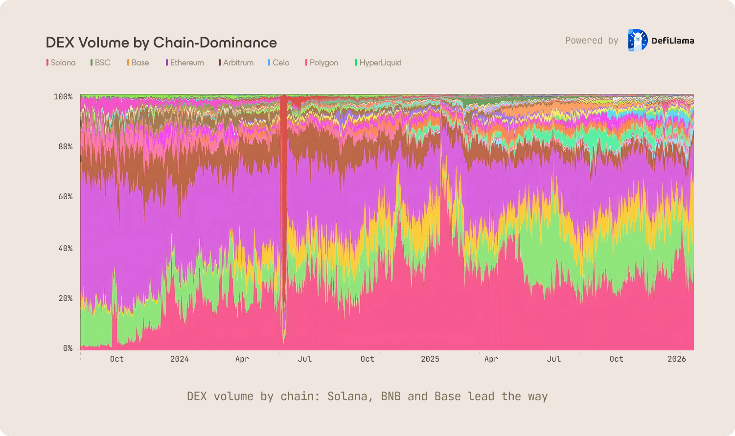 On BNB Chain, PancakeSwap commands the majority of DEX volume, averaging $1.5B daily in Q4 2025 and holding 56-77% chain market share throughout the year, according to Messari Research. PancakeSwap's distribution extends across the Binance ecosystem, with Binance Wallet supporting PancakeSwap across BNB Chain, Ethereum, Base, Arbitrum, Linea, zkSync Era, Polygon zkEVM, and opBNB.