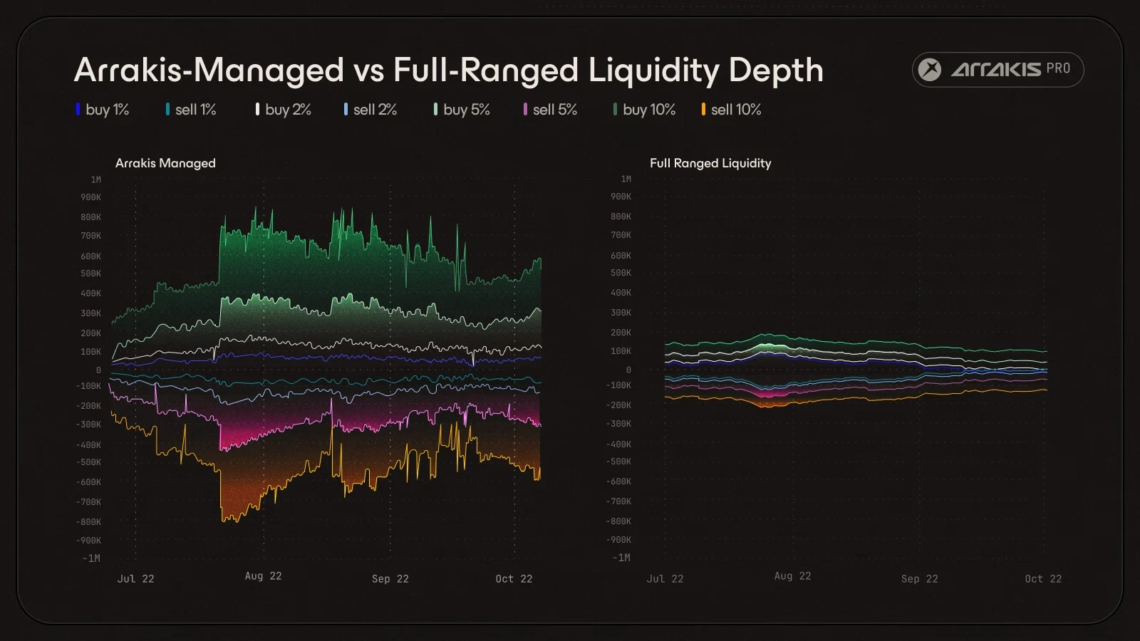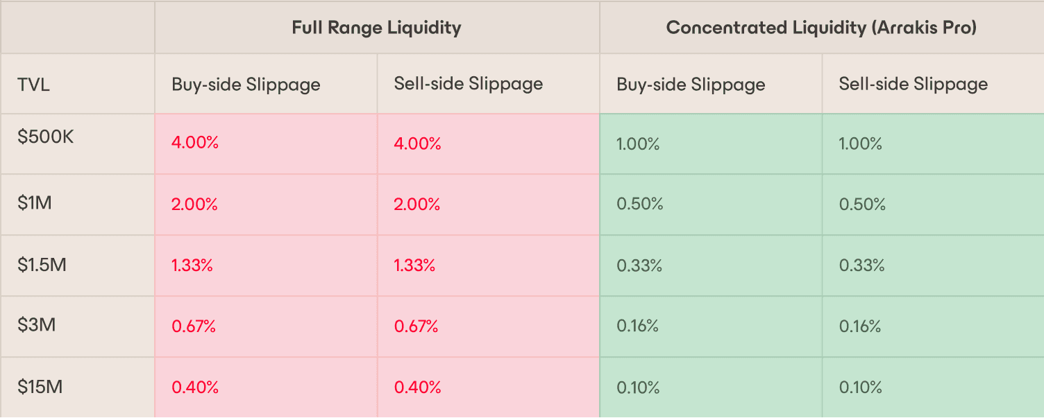 A pool with $500K TVL in a full-range position produces approximately 4 % slippage on a $10K trade. The same trade produces 1 % slippage in a concentrated position via Arrakis Pro.