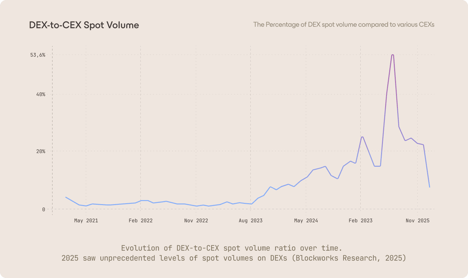 Your market depends on infrastructure you do not control. CEX listings can be revoked, market maker terms can change, and rented liquidity can unwind. If your onchain liquidity is a passive afterthought, there is no fallback. DEX-to-CEX spot volume ratios have increased approximately sixfold over the past five years according to research by Blockworks. The venue that most teams underinvest in is the one gaining the most share.