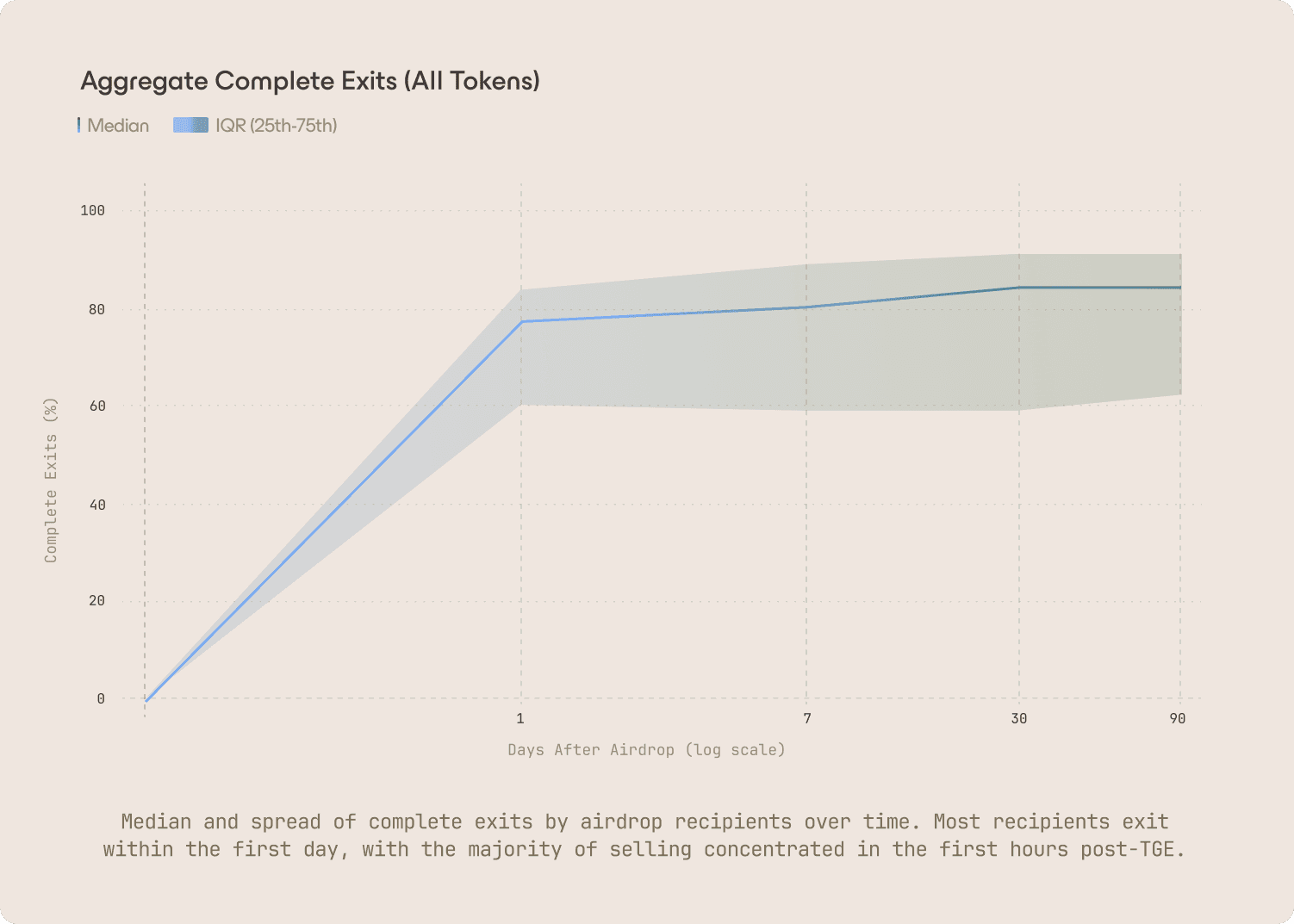Pre-sale participants show meaningfully different behavior. Data from CoinList indicates 60–65% retention after 24 hours, compared to 20–30% for airdrops. After 30 days, roughly 40% still hold. Cost basis changes incentives.