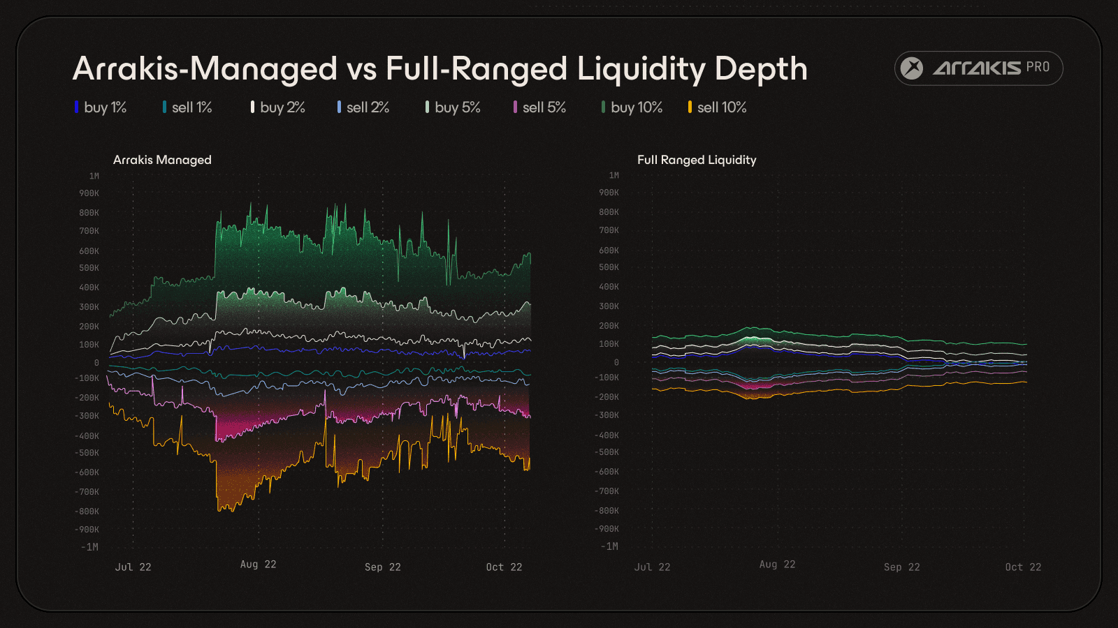 Concentrated management (left) delivered up to 3× greater depth per dollar deployed versus passive full-range positioning (right) for VSN on Uniswap.