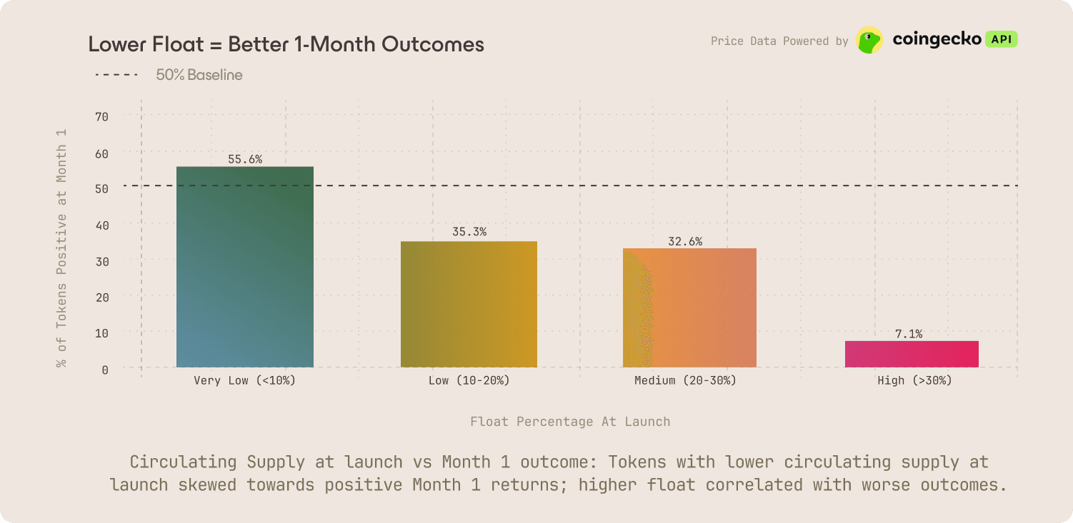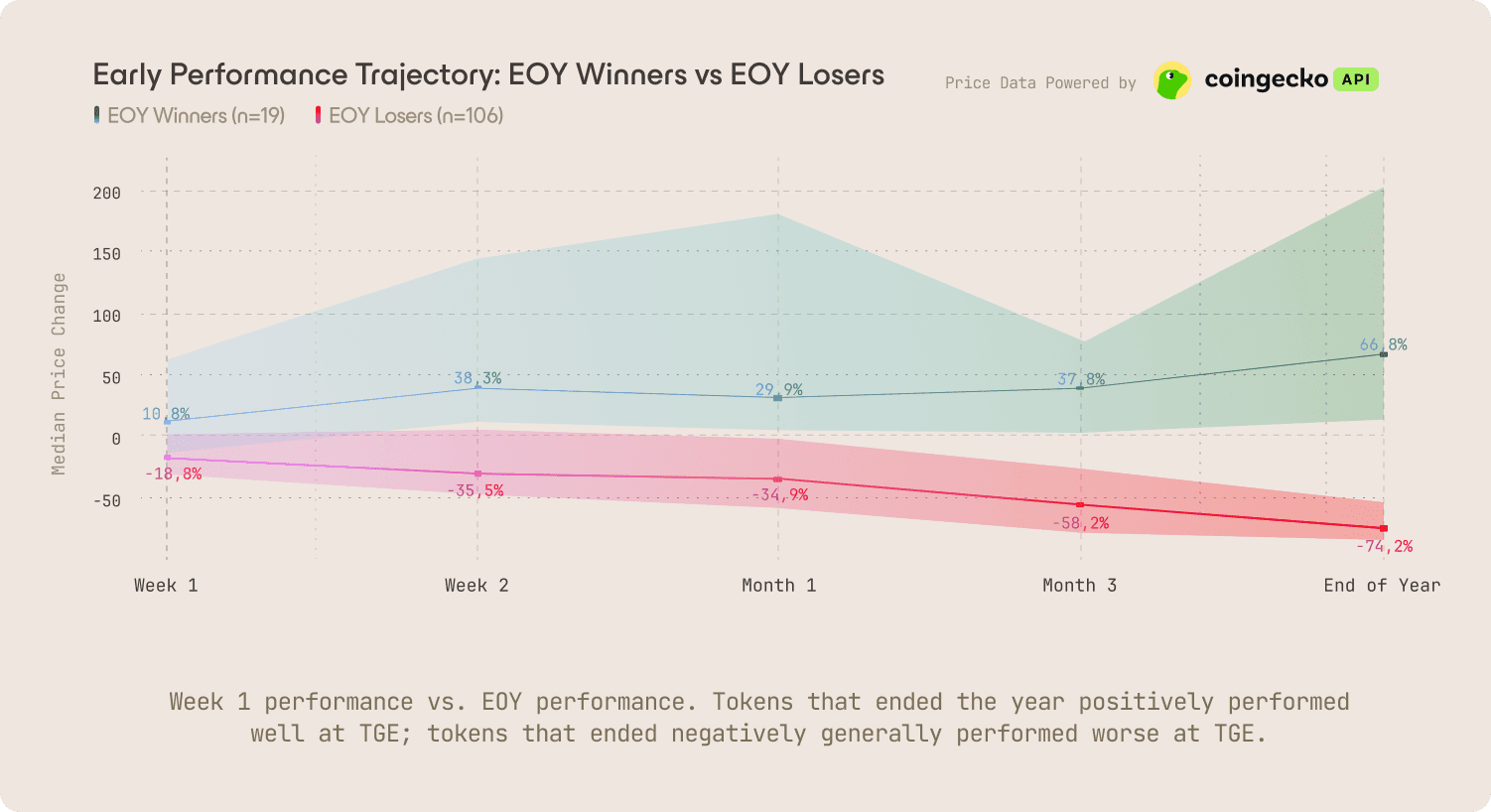 Week 1 is nearly irreversible. Only 9.4% of tokens that declined in their opening week recovered by year-end. A strong launch is necessary but not sufficient for success, while a weak one is nearly unrecoverable. Getting the sizing of distribution mechanisms based on realistic sell pressure right can meaningfully change outcomes.