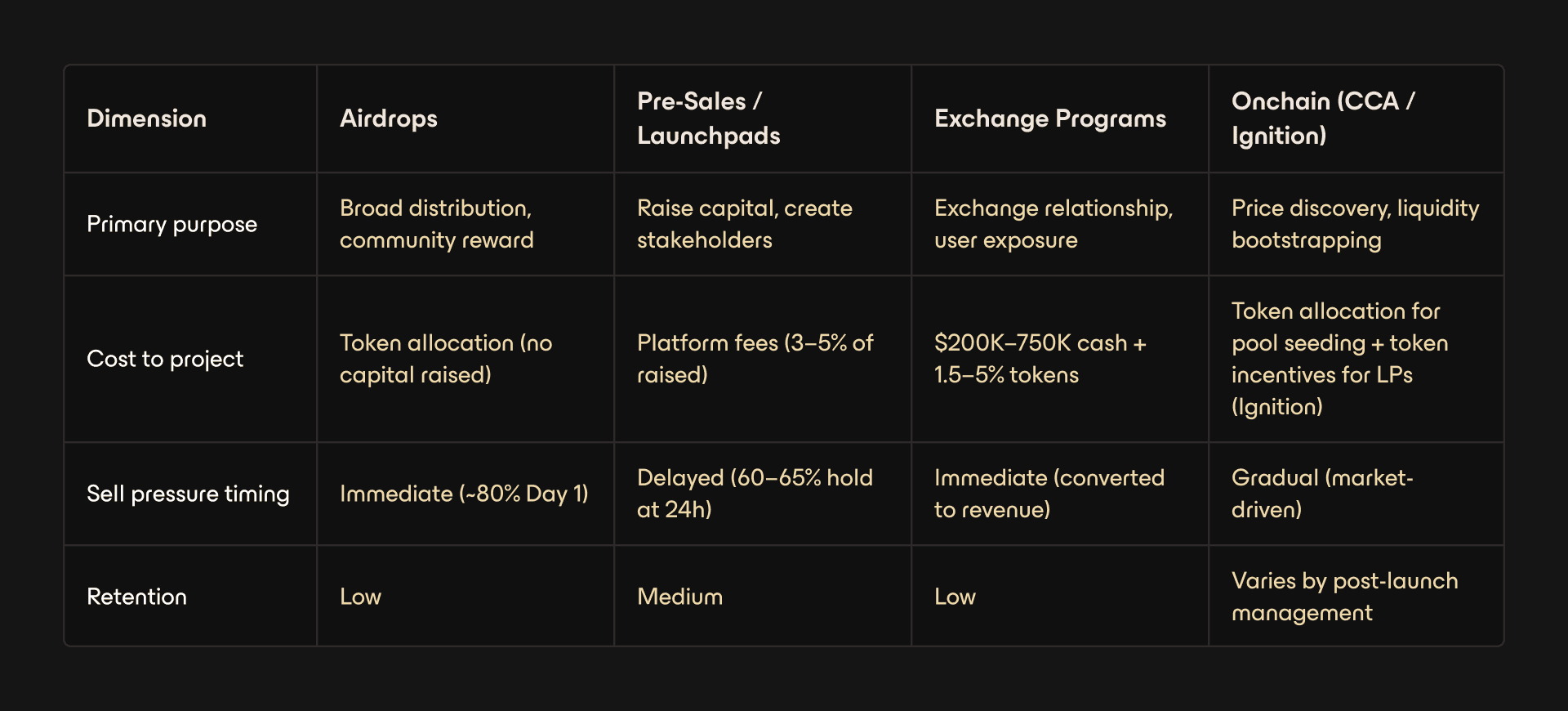 In contrast to airdrops and pre-sales, both exchange programs and onchain mechanisms create functioning DEX spot markets as part of the distribution event. The difference is ownership and transparency: onchain mechanisms produce protocol-owned liquidity with permissionless price discovery, while exchange programs create markets on terms and infrastructure controlled by the exchange.